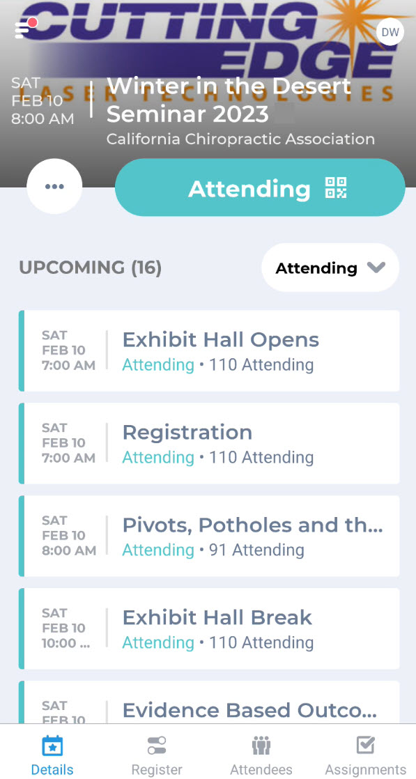 CalChiro notified all the confirmed attendees to download the Eventene mobile app prior to the conference to have all the event's info on the mobile device. The main Details page in the app showed each attendee their own personalized itinerary, with the agenda, session briefs, speaker bios, lists of sponsors, and hotel and dining options just a click away. Additionally, the attendees were able to view the list of attendee names, then click on them to view their public profile details, including email and mobile phone. Attendees had the option to hide their profile from public view, if they preferred, but most kept the public to foster a stronger community network.