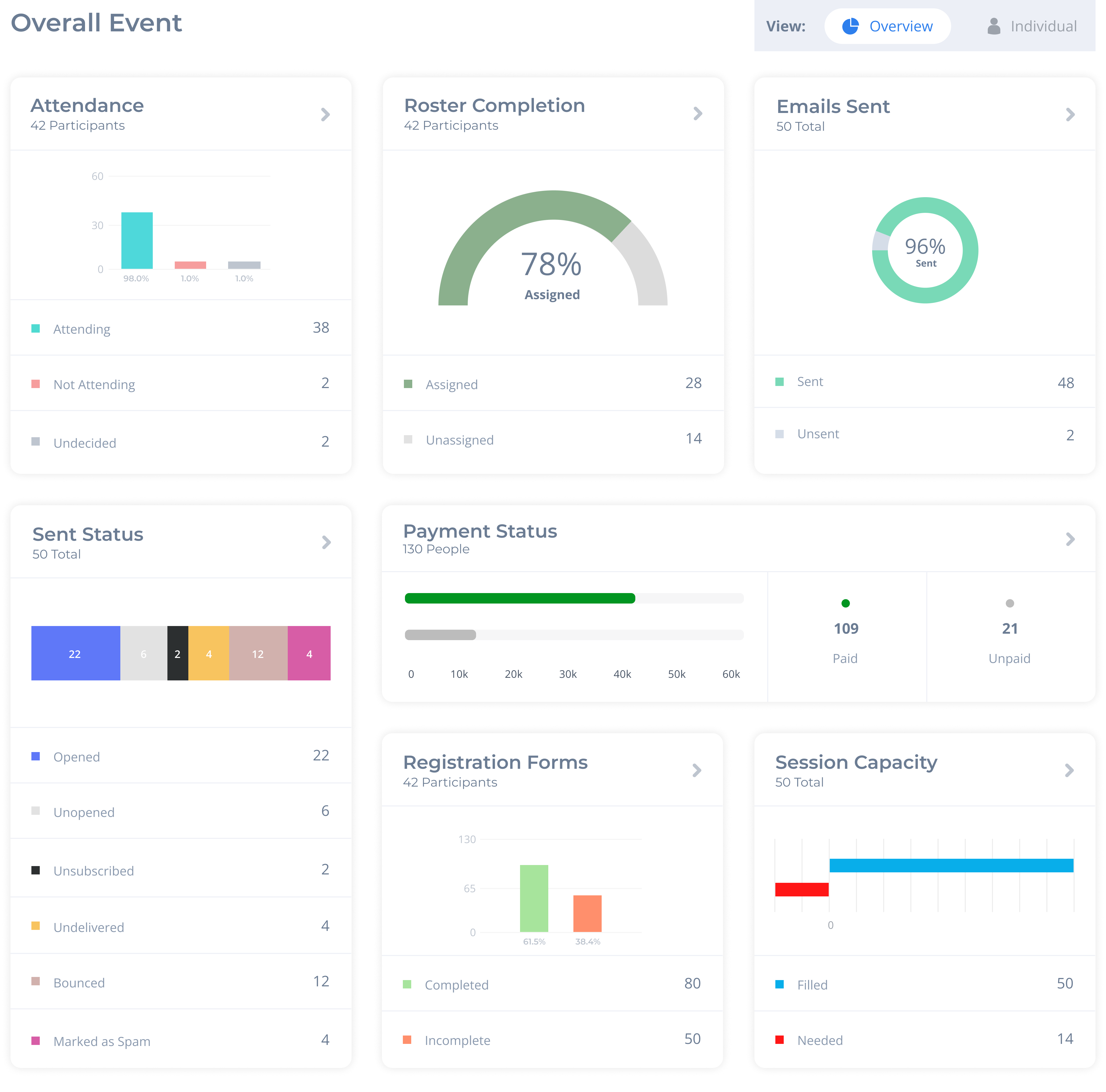 Import or build participant groups. Create cohorts and subgroups. Manage enrollment, confirmations, and waitlists — each program instance gets its own clean roster.
